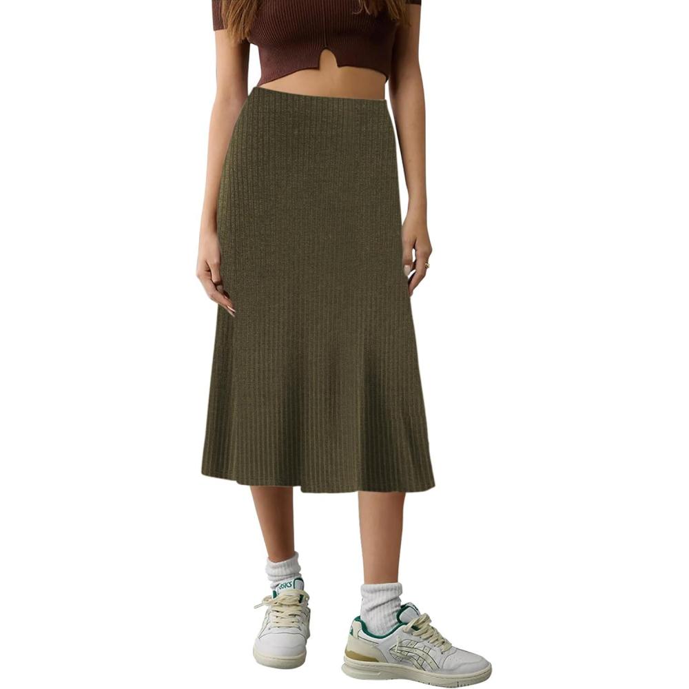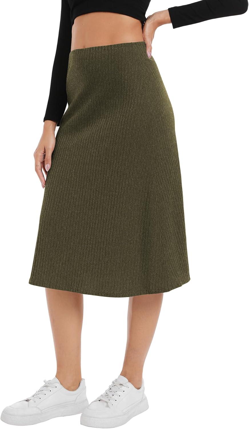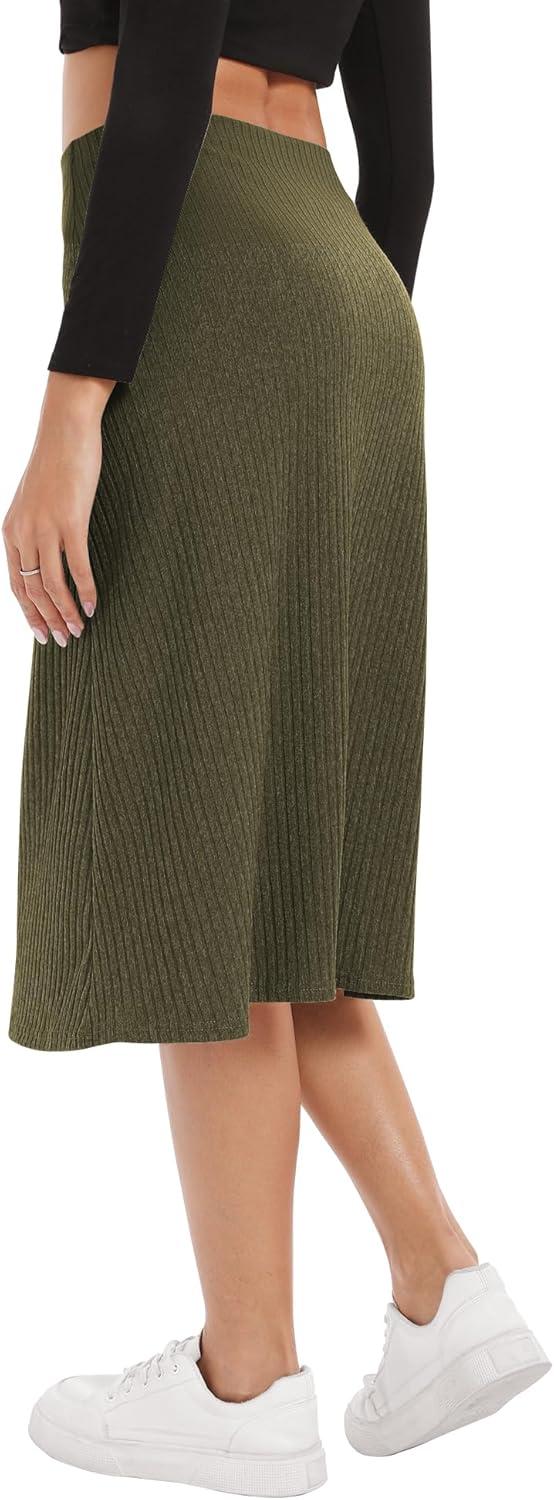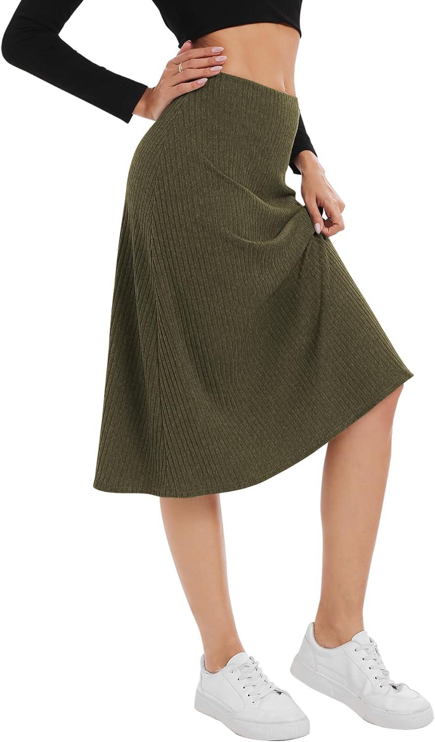 Urban CoCo Women's Elastic High Waist A-Line Flared Midi Skirt Solid Ribbed Knit Skirts(Army Green)