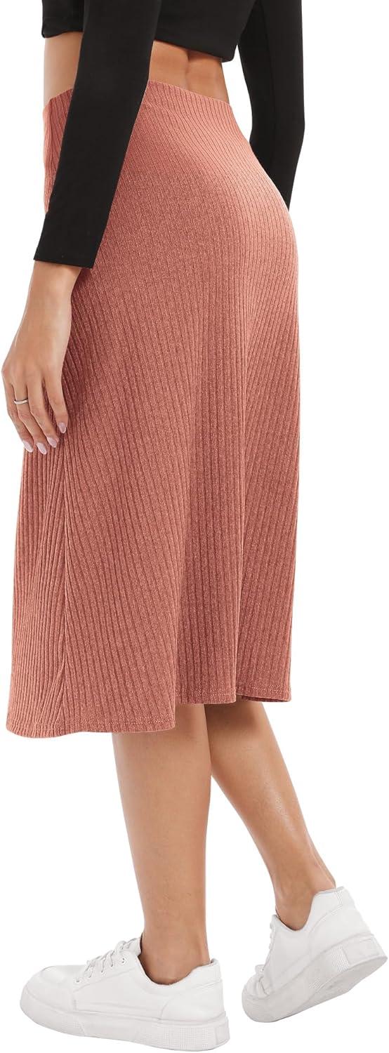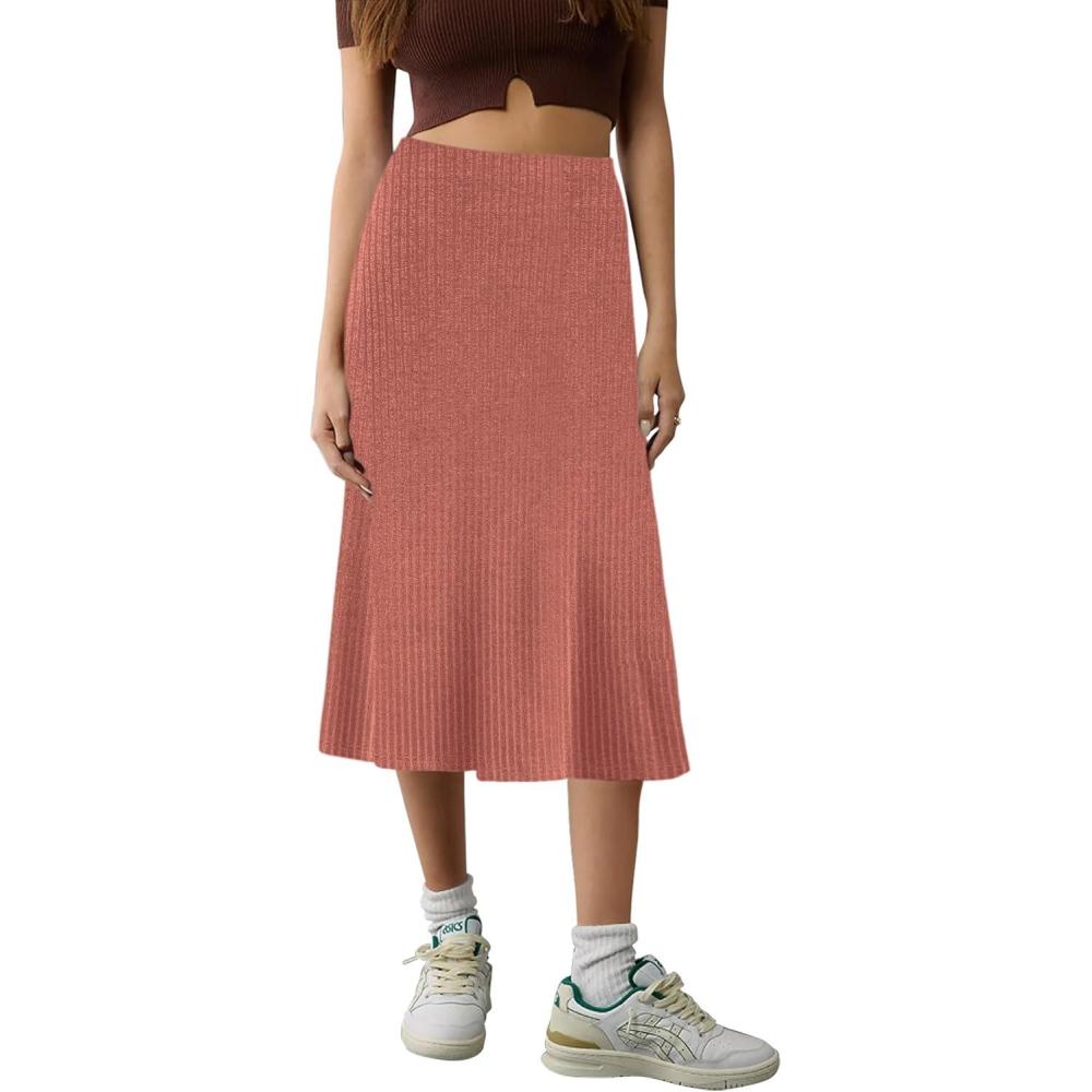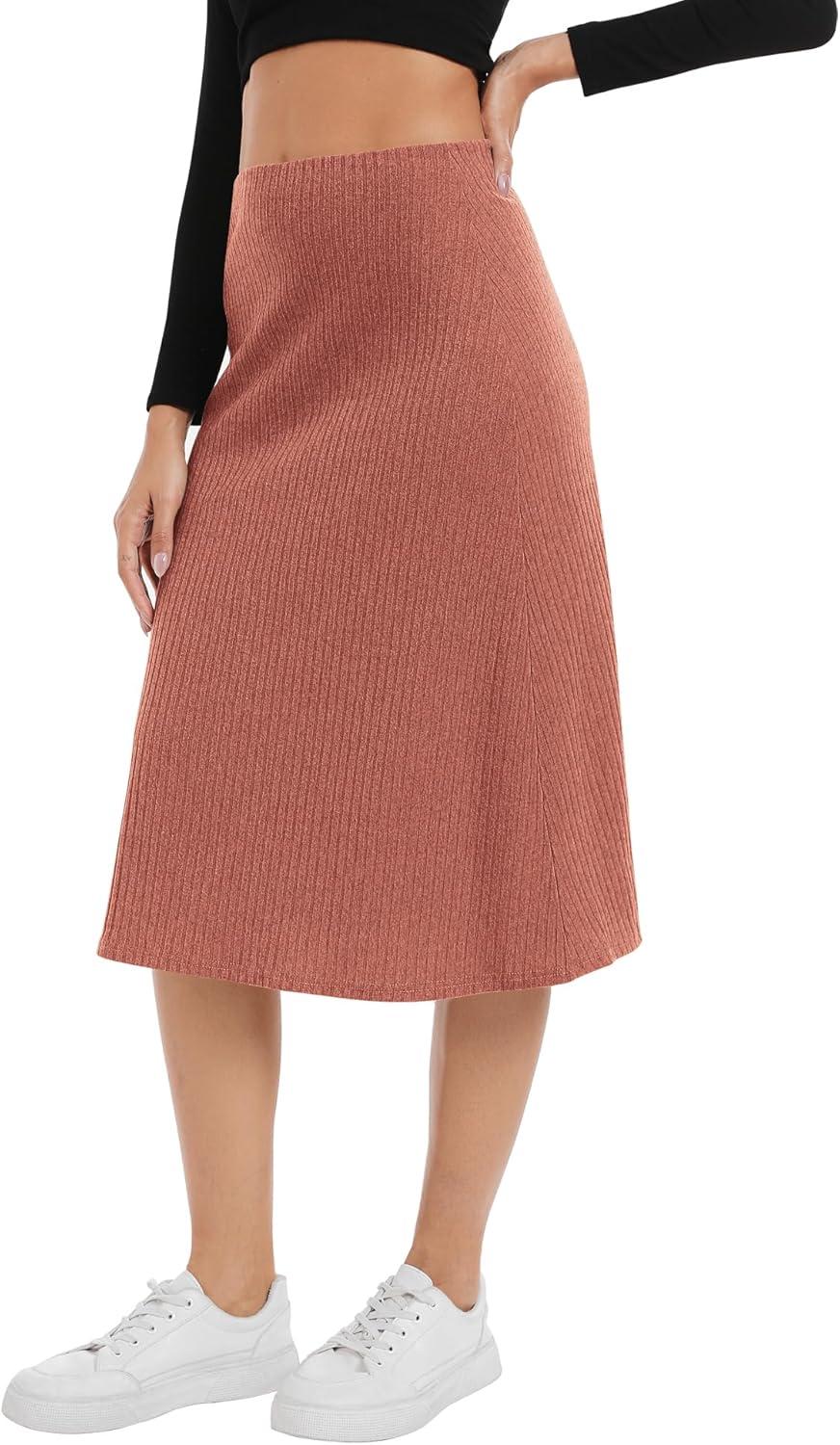 Urban CoCo Women's Elastic High Waist A-Line Flared Midi Skirt Solid Ribbed Knit Skirts(Burnt Brick)