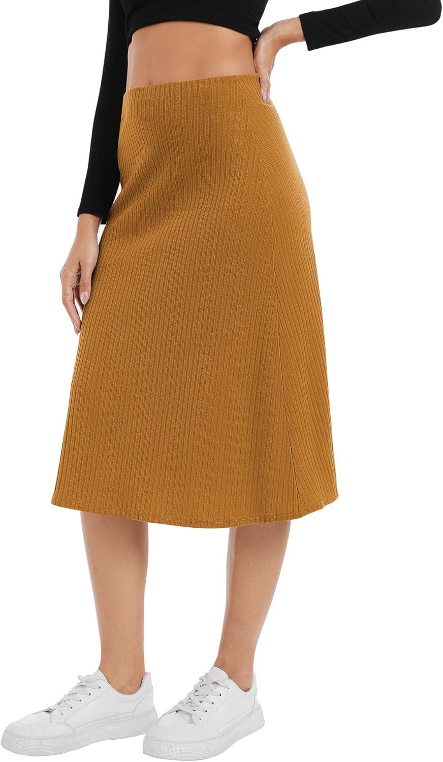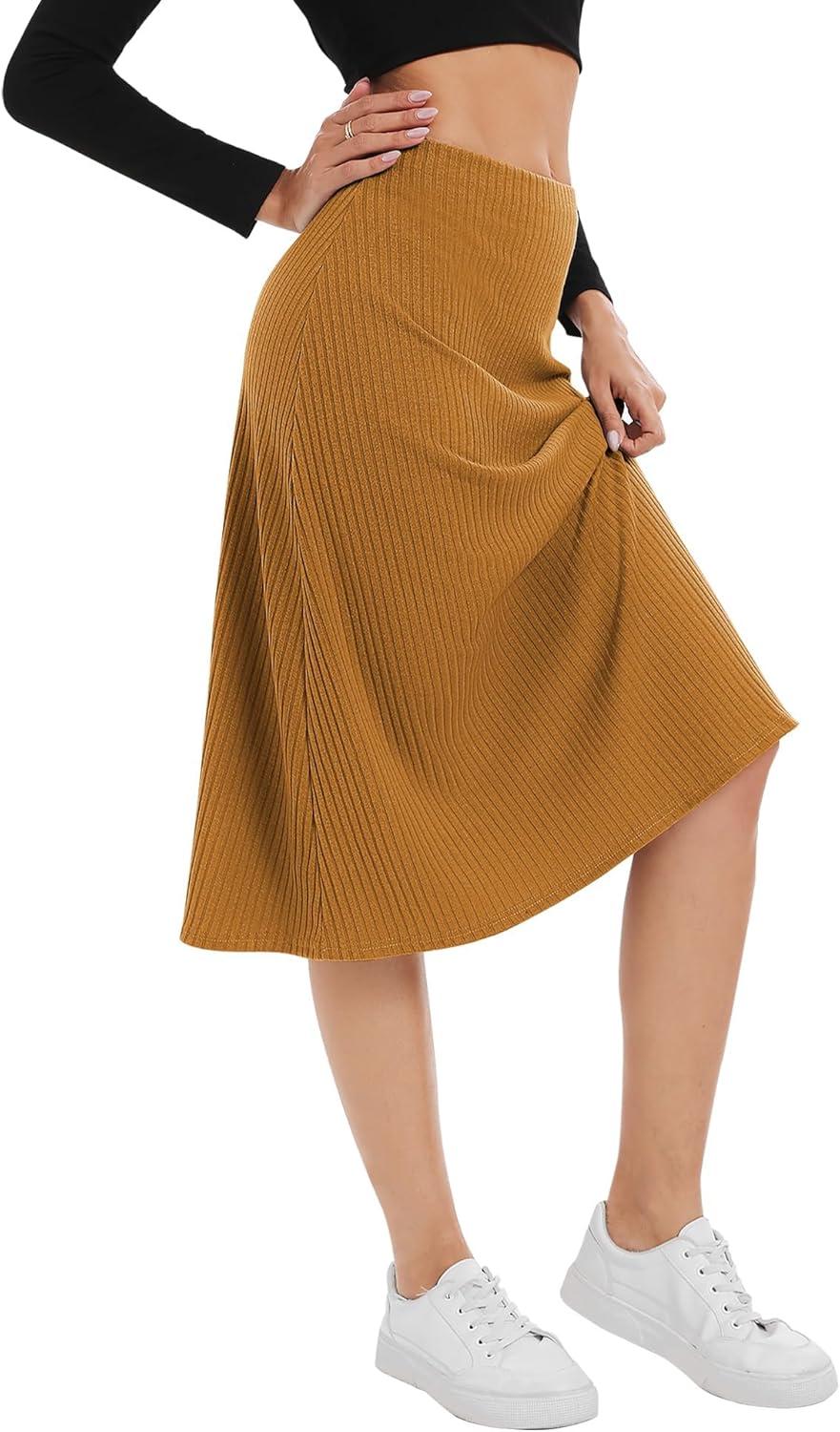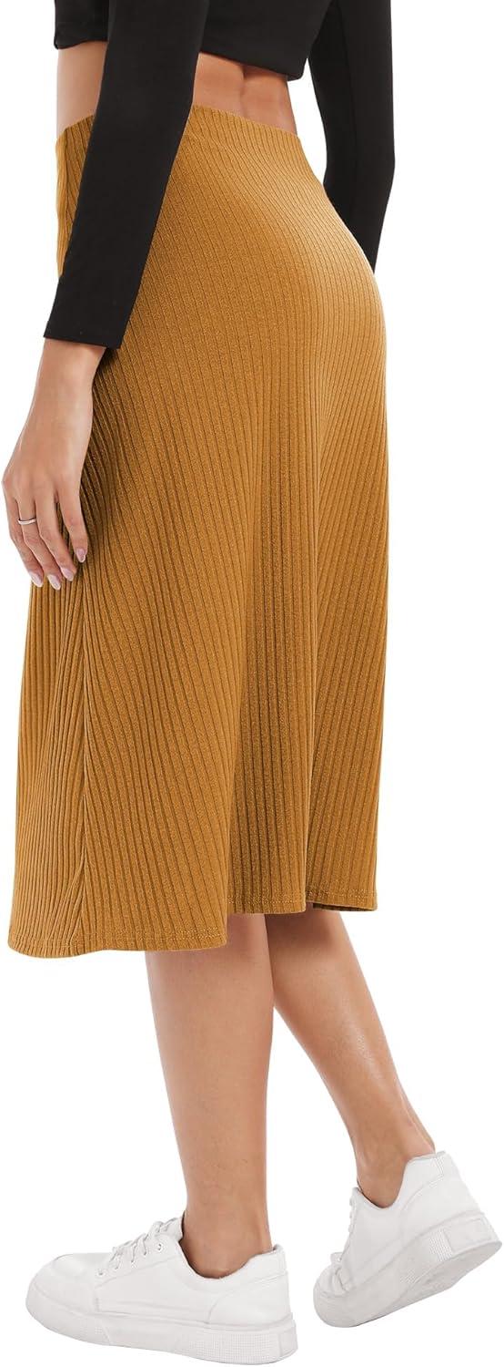 imageUrban CoCo Womens Elastic High Waist ALine Flared Midi Skirt Solid Ribbed Knit SkirtsCamel