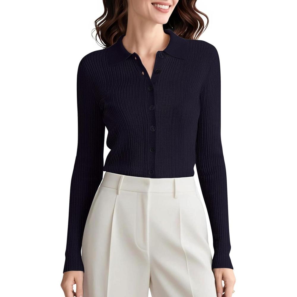 Urban CoCo Women’s Long Sleeve Button Up Sweater Polo Shirt Collared Knit Cardigan Sweaters(Navy Blue)