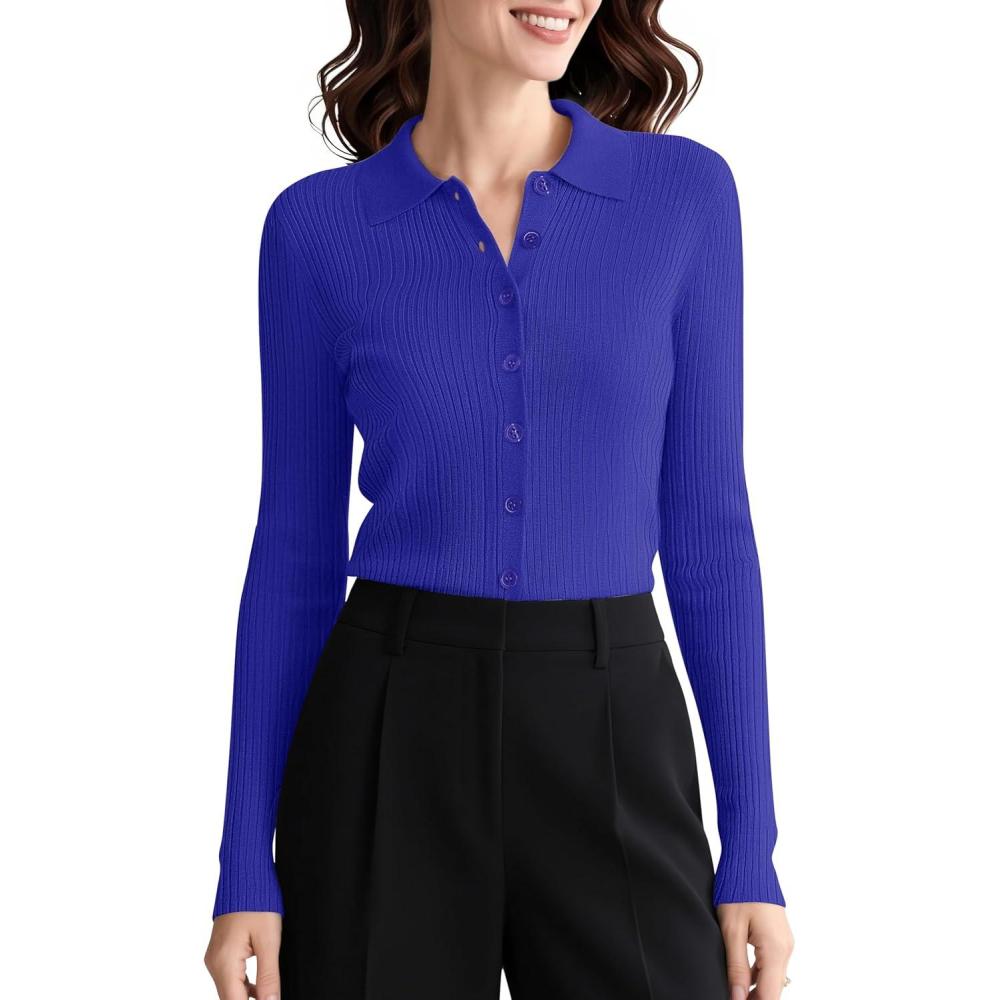 imageUrban CoCo Womens Long Sleeve Button Up Sweater Polo Shirt Collared Knit Cardigan SweatersRoyal Blue